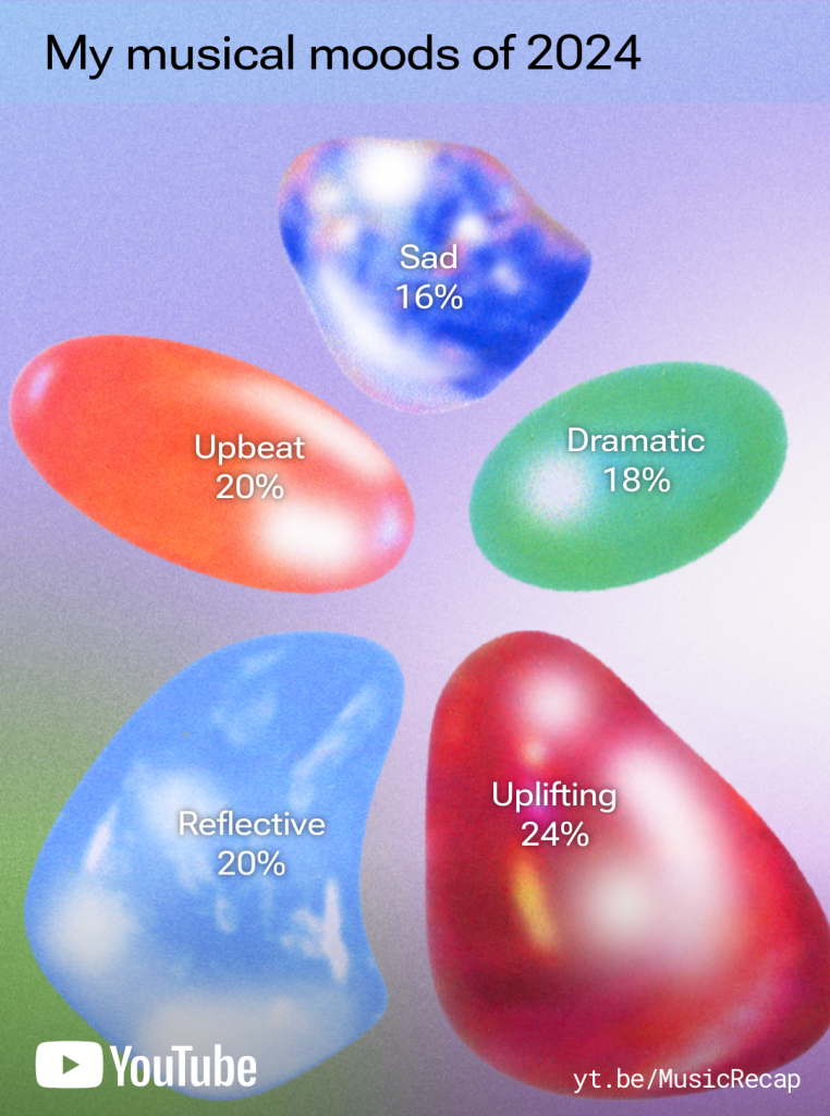 YouTube mi-a făcut un rezumat excelent pentru 2024. Procentele nu sunt absolute. Uneori e o probă doar să pot asculta ceva trist sau dramatic, chiar dacă eu nu sunt în acea stare. Pentru mine e o probă de stabilitate emoțională. Dar și dac-ar fi procente absolute, cred că o viață divers colorată și echilibrată poate să arate și așa: