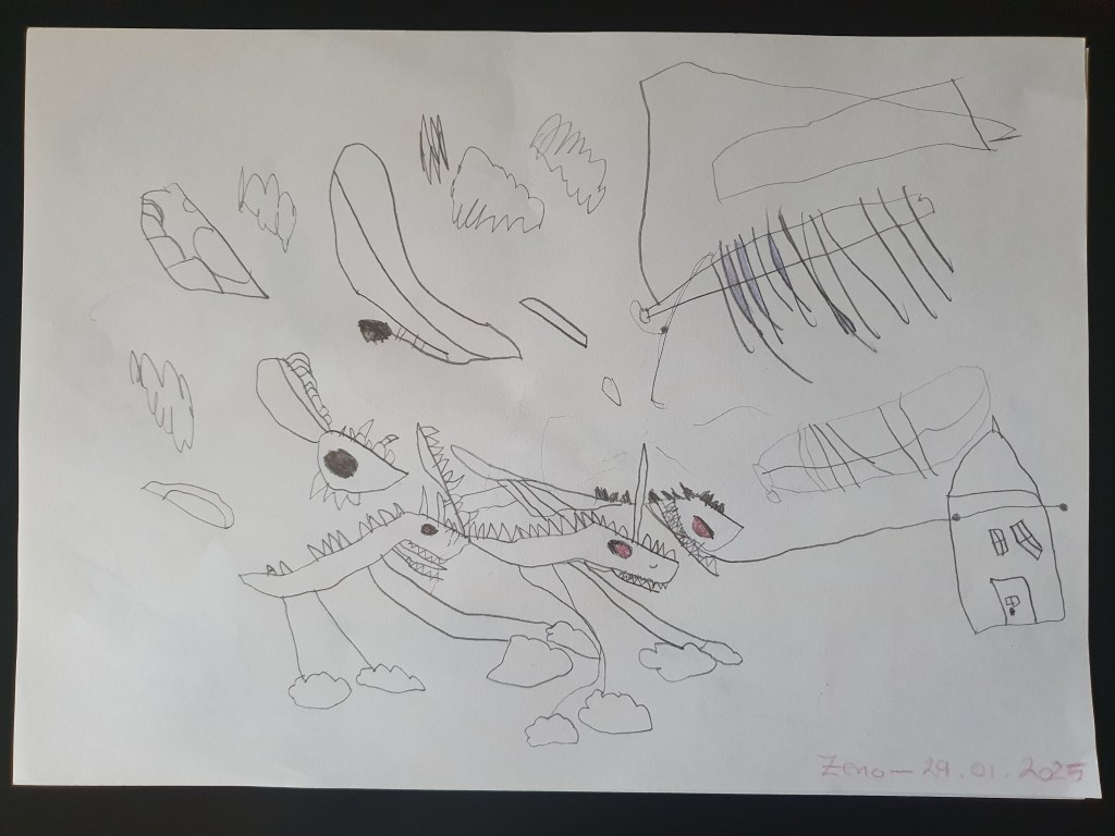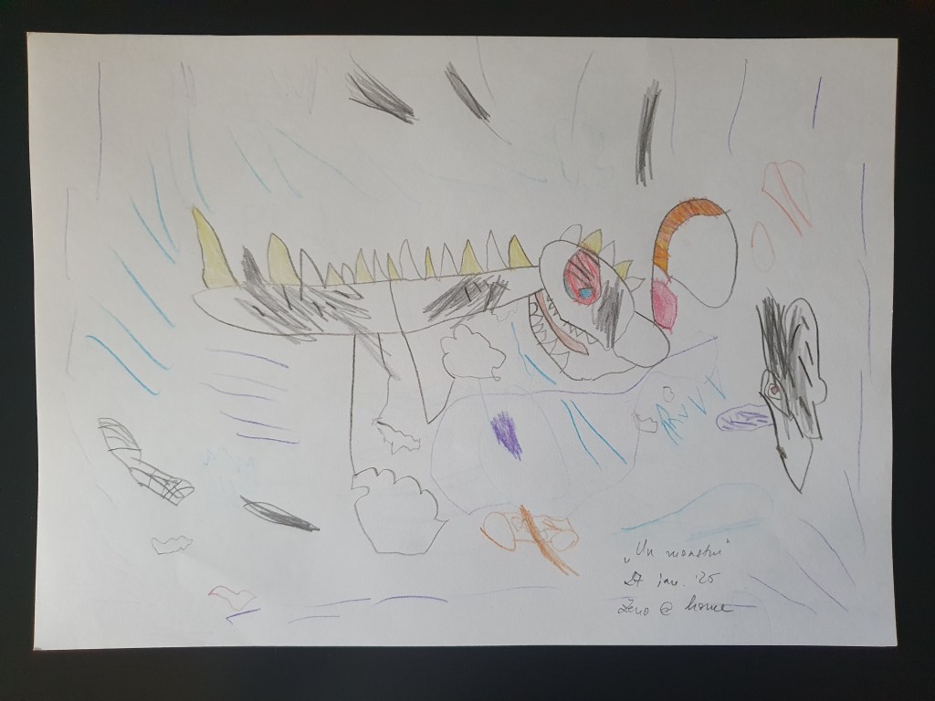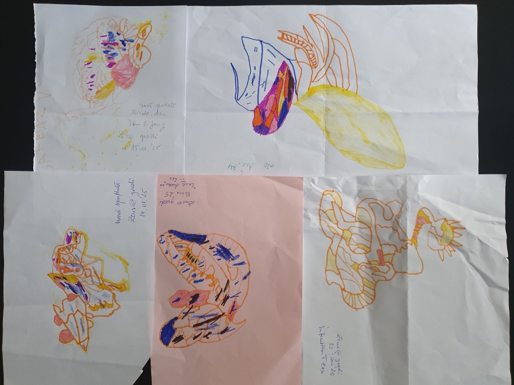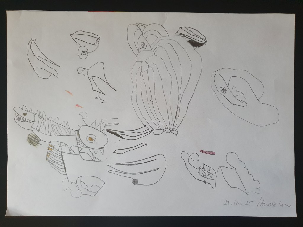 Faza post-Dino (care nu a trecut chiar de tot; faza Dino rămâne fundație solidă și de mare inspirație) este cu – da, ați citit bine – intestine și monștri. E chiar simpatic cum a ajuns să fie preocupat de intestin, a pornit tot de la dinozauri. În cartea noastră mai serioasă despre aceste creaturi e o imagine care ilustrează reconstituirea principalelor organe, la care îmi cerea mereu să-i explic cum funcționează (de la “intră mâncarea prin gură (…) ajunge în stomac” etc. – până la capăt!) Așa a devenit interesat de ceea ce se află înăuntru, în general, iar în paralel a mai învățat și la grădi și la terapie despre corpul uman. Așa a ajuns să se uite pe YouTube la tot felul de materiale despre anatomia omului (că despre cea a dinozaurilor nu prea am găsit), majoritatea în engleză – atât pentru oameni mici, cât și pentru oameni mari (la unele chiar nu mă puteam uita, atât de viscerale erau… iar el se uita cu ochii cât cepele). Nu știu cum a ajuns tocmai intestinul să fie subiect de maxim interes, trecem peste asta. Știu doar că prin toamnă-iarnă a început să deseneze niște guguloaie greu de înțeles, despre care el zice că sunt intestine și, vrem nu vrem, trebuie să-l credem pe cuvânt. Mai jos e ce-am strâns în ultima lună de la grădi, de când ne-am mutat în casa nouă – pe cele mai vechi n-am apucat să le aduc și să le sortez.