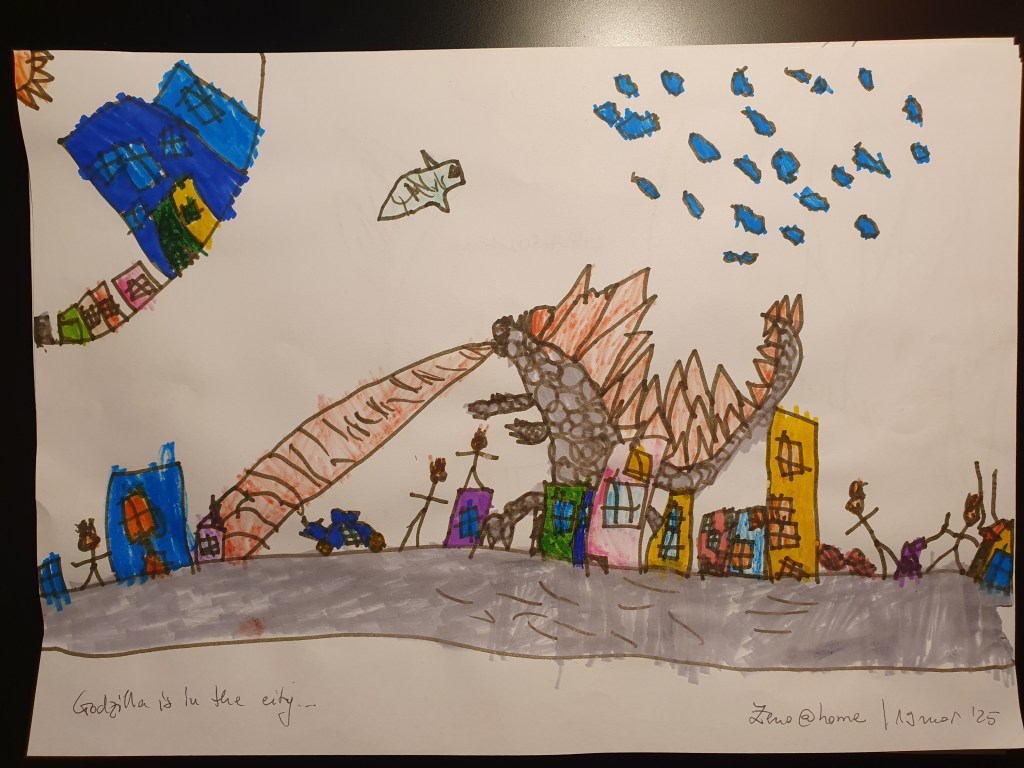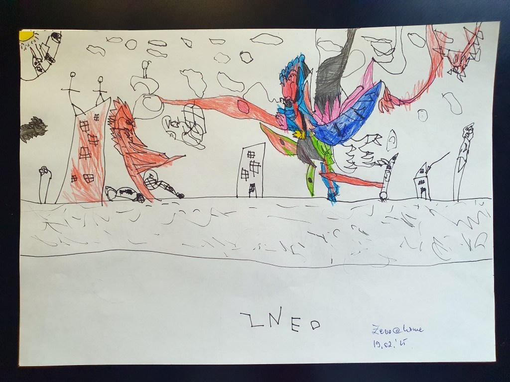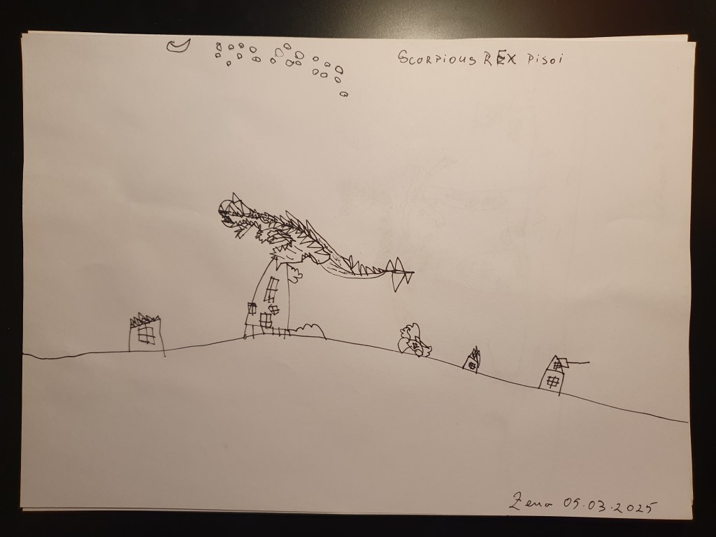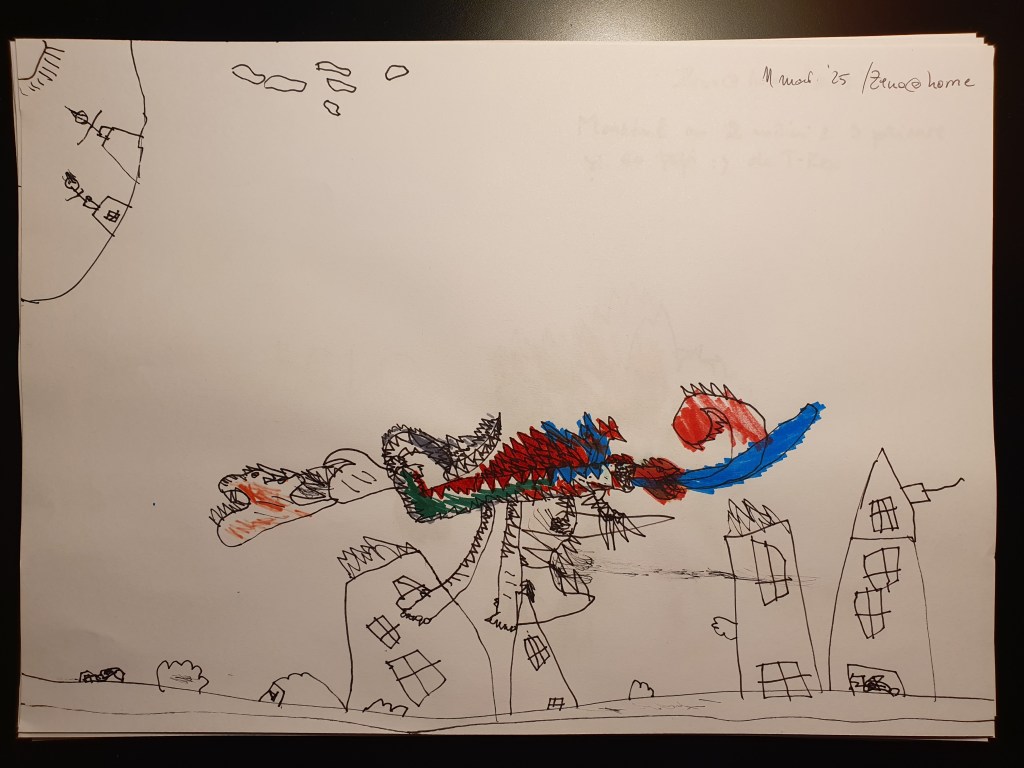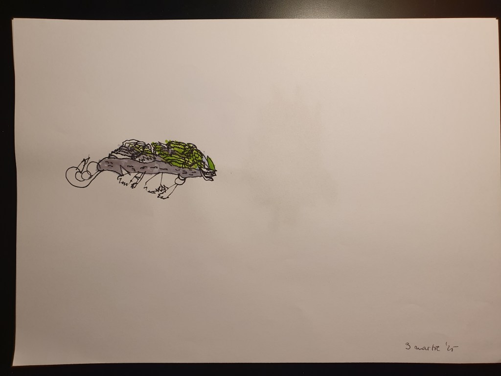 E o selecție făcută pe la jumătate, sunt vreo 40 în total – unele mai mâzgăleli decât altele. În tema lunii au rămas monștrii (par să fi dispărut intestinele), care moștri bântuie și distrug (sau apără!) orașe. Avem și câteva case, mașini și oameni în peisaje 🙂 Și străzi! Zice el că pe alocuri sunt și copaci, dar încă sunt greu de recunoscut. Pe undeva apare și Mini a lui Mickey Mouse, dar numai noi știm unde.