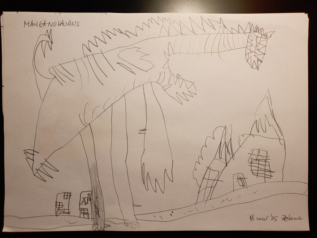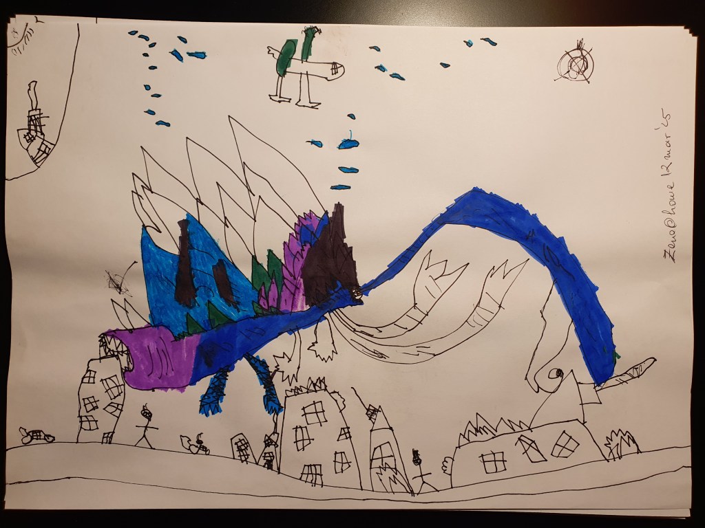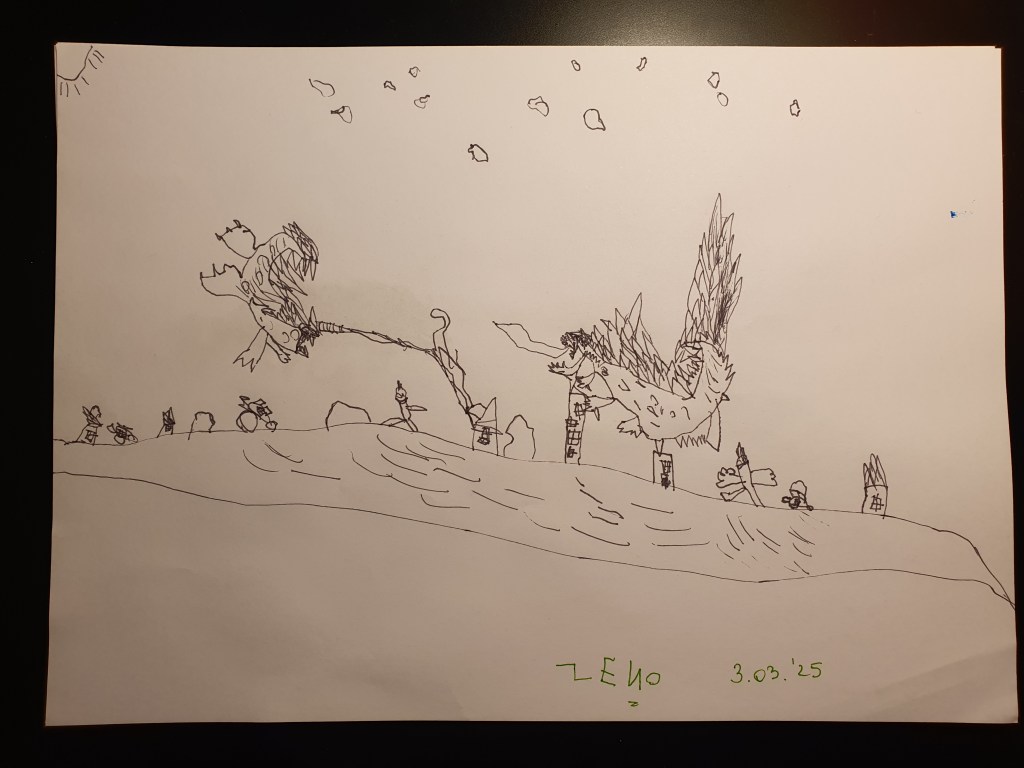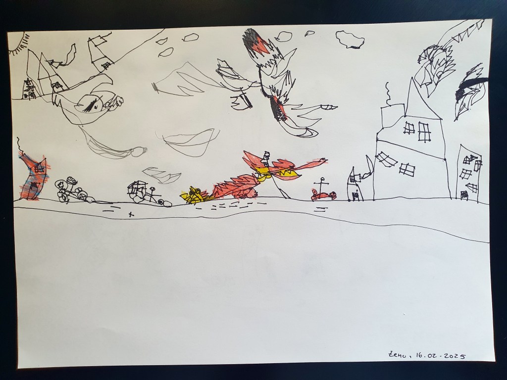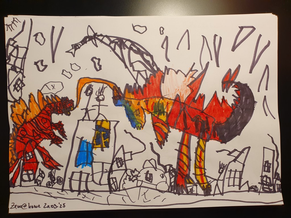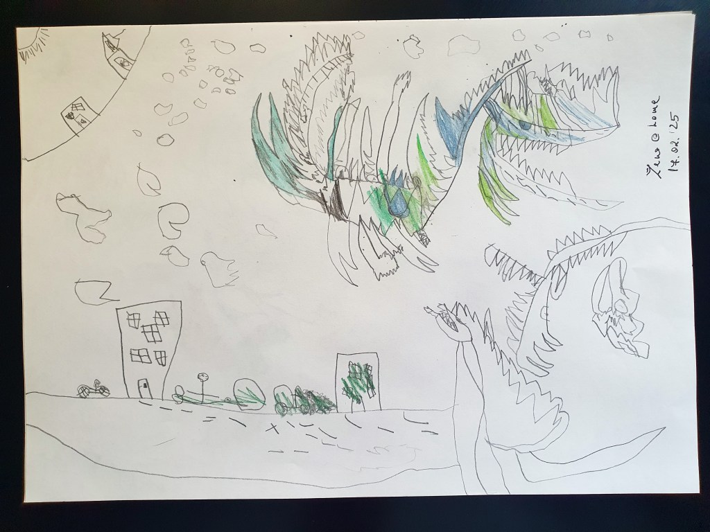 E o selecție făcută pe la jumătate, sunt vreo 40 în total – unele mai mâzgăleli decât altele. În tema lunii au rămas monștrii (par să fi dispărut intestinele), care moștri bântuie și distrug (sau apără!) orașe. Avem și câteva case, mașini și oameni în peisaje 🙂 Și străzi! Zice el că pe alocuri sunt și copaci, dar încă sunt greu de recunoscut. Pe undeva apare și Mini a lui Mickey Mouse, dar numai noi știm unde.