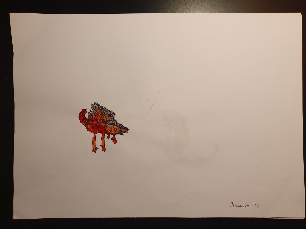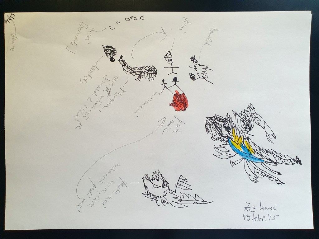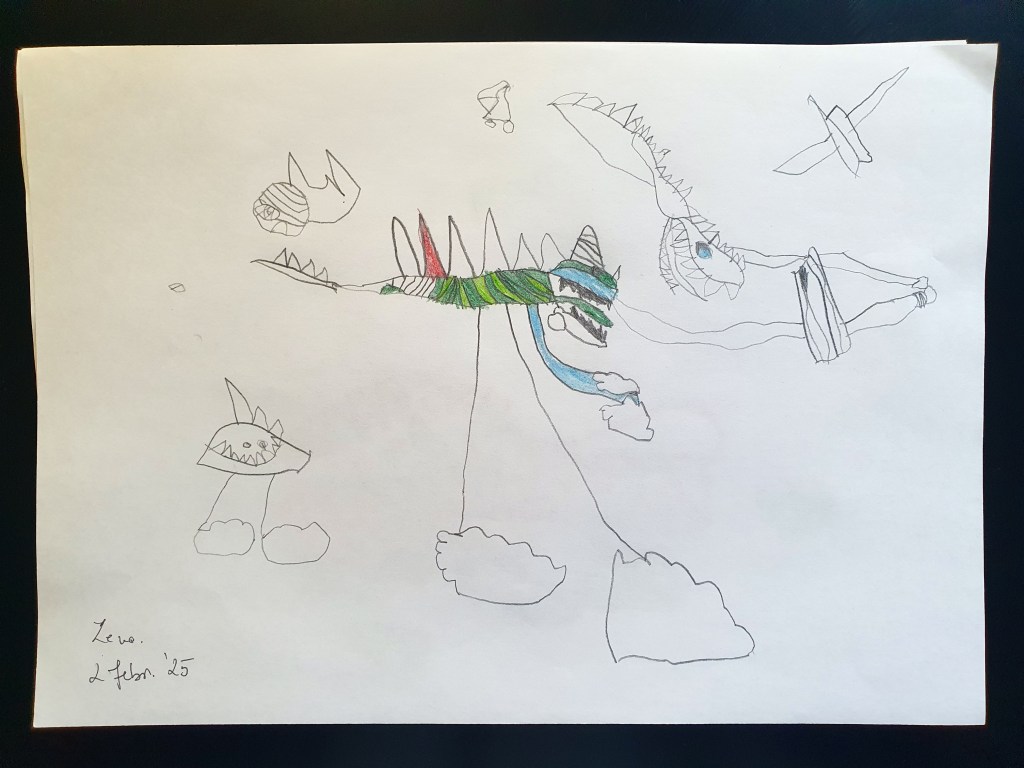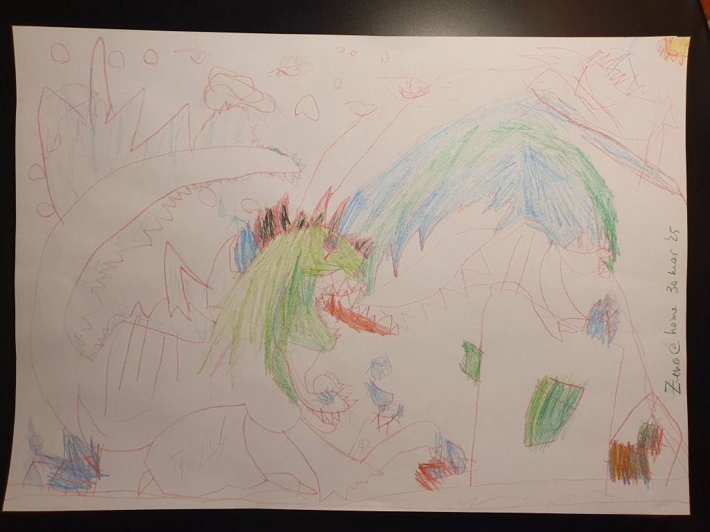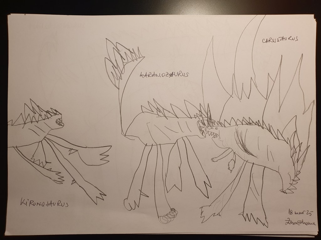 E o selecție făcută pe la jumătate, sunt vreo 40 în total – unele mai mâzgăleli decât altele. În tema lunii au rămas monștrii (par să fi dispărut intestinele), care moștri bântuie și distrug (sau apără!) orașe. Avem și câteva case, mașini și oameni în peisaje 🙂 Și străzi! Zice el că pe alocuri sunt și copaci, dar încă sunt greu de recunoscut. Pe undeva apare și Mini a lui Mickey Mouse, dar numai noi știm unde.