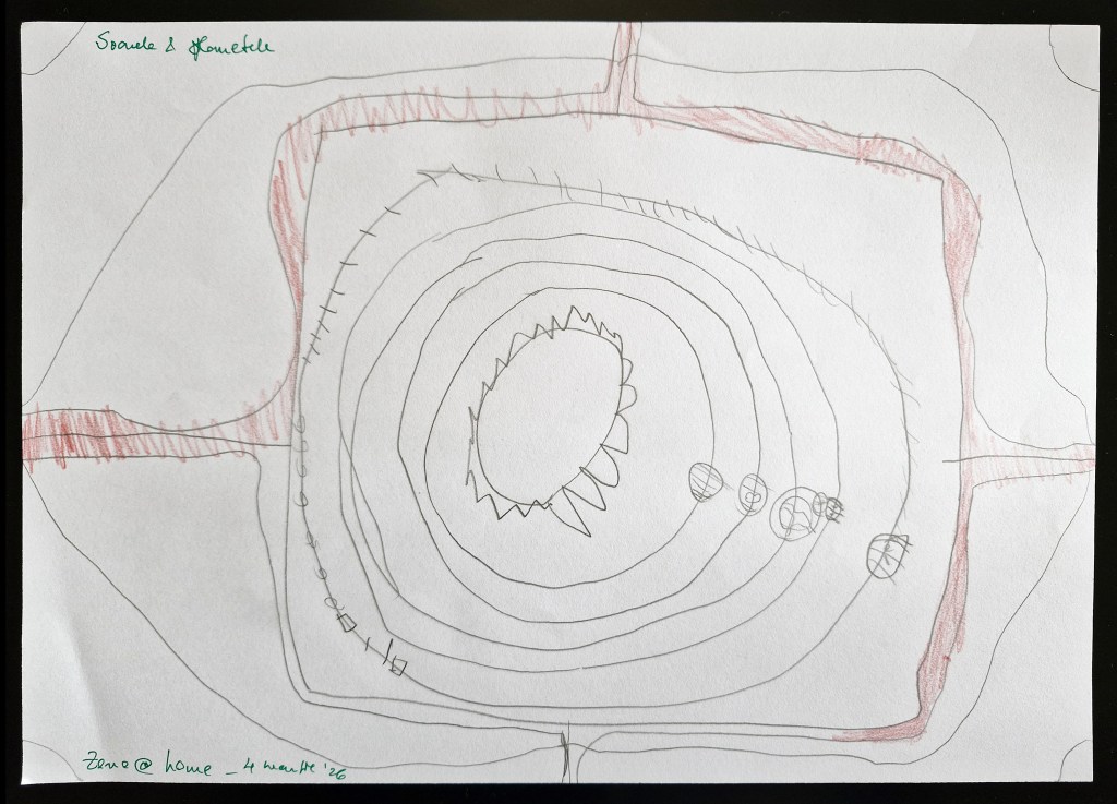 Cele două în sus sunt, în aceeași paralelă a casei din Sibiu, podul și turnulețul. În pod e locul unde “merg” să-mi interoghez stările, gândurile și reperele. Iar uneori, când prind mai mult avânt, ajung și în turnuleț, unde mă bucur de faptul că reușesc să văd viața cu optimism și mă încarc pozitiv din realitatea de moment – că e o plimbare în parc sau o conexiune autentică cu cineva drag.